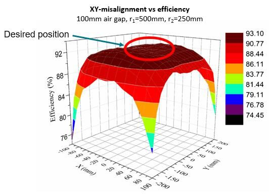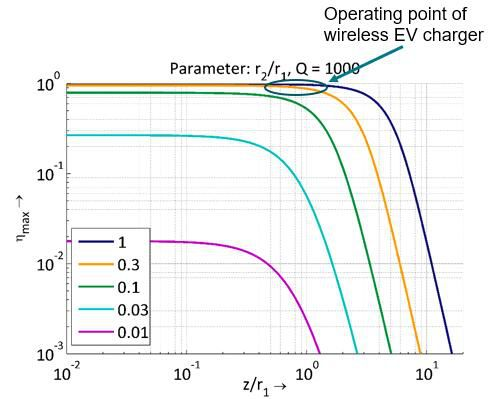 圖中的縱坐標為充電效率,橫坐標為接收器和發(fā)射器之間的距離和發(fā)射器直徑之比。不同顏色的線(xiàn)條代表的是不同尺寸的接收器。通過(guò)圖中的曲線(xiàn),我們很容易發(fā)現當接收器和發(fā)射器距離到達臨界值時(shí),充電效率會(huì )大幅下降。